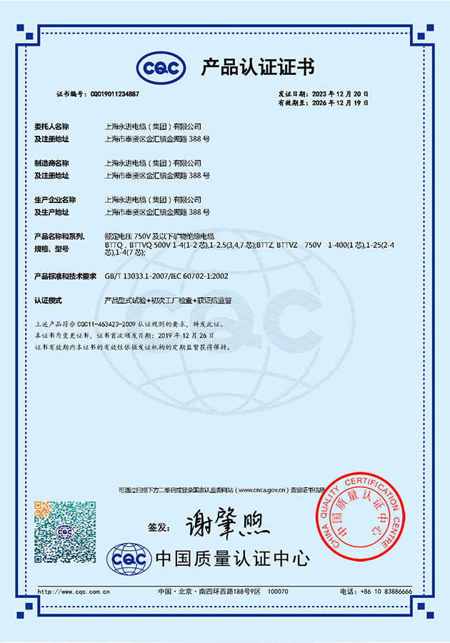 CQC礦物絕緣電纜產(chǎn)品認(rèn)證證書